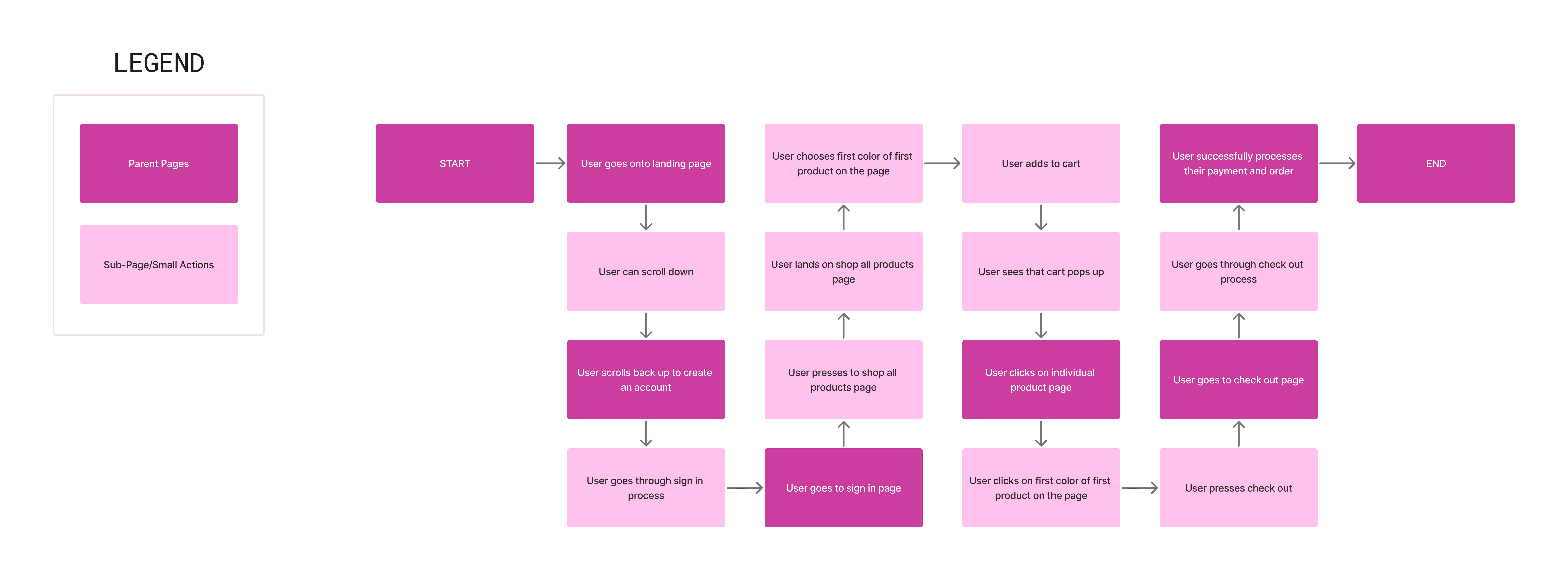 To understand our users' needs, we created a user flow to help us understand their process of finishing an important task on our app. Here you will see the user going onto the landing page, creating an account, signing in, and purchasing a beauty product.